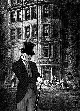 Estaba muy pálido, y sus ojos parecían salirse de sus órbitas, mientras, con una mezcla de terror y asombro, miraba fijamente a un hombre alto y delgado, de nariz aguileña, bigote negro y barba en punta, que también estaba observando a la muchacha bonita. La estaba mirando tan embebido que no se percató de nuestra presencia, y por ello pude echarle un buen vistazo. Su cara no era una buena cara; era dura y cruel, y sensual, y sus grandes dientes blancos, que se miraban más blancos por el encendido rojo de sus labios, estaban afilados como los de un animal.