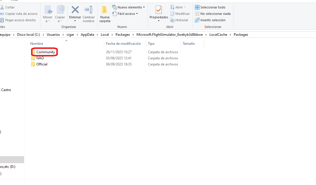 C:/Usuarios/tu usuario /AppData/Local/Packages/Microsoft.FlightSimulator_8wekyb3d8bbwe/Local Cache/Packages/Community