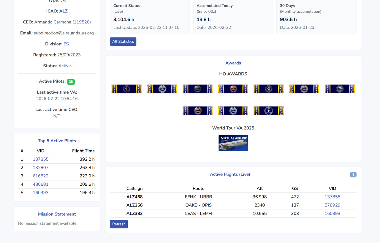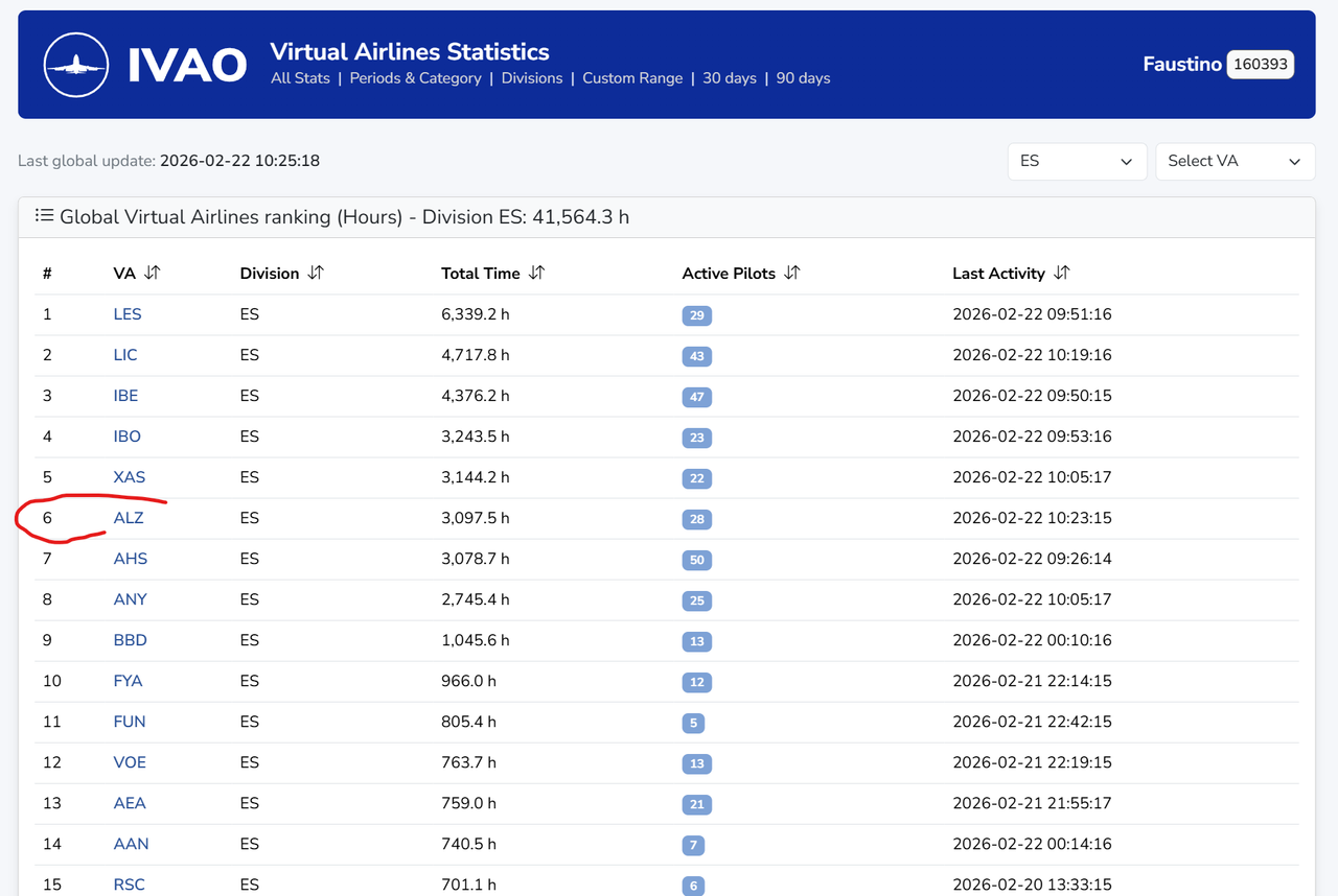 Podeis jugar con los filtros de busqueda y ver todo lo relacionado con las Va's en IVAO, ALZ está entra las 6 primeras en España y a nivel Mundial la 25. "nada mal"